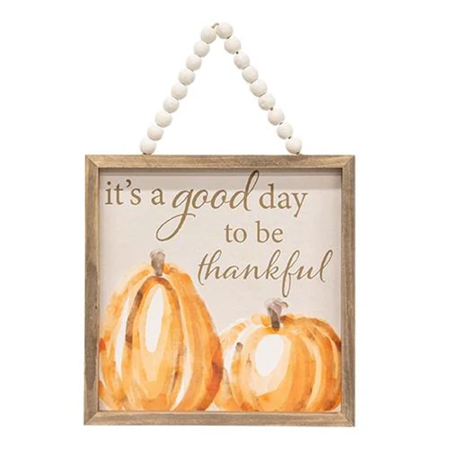 Count Your Blessings Beaded Sign is an assortment of two framed signs. Sign has a tan background with a watercolor pumpkin graphic and its frame is unpainted to complement rustic and primitive decor. Sign comes ready to hang by a white beaded hanger and it reads, "count your blessings," or, "it's a good day to be thankful" in brown lettering.