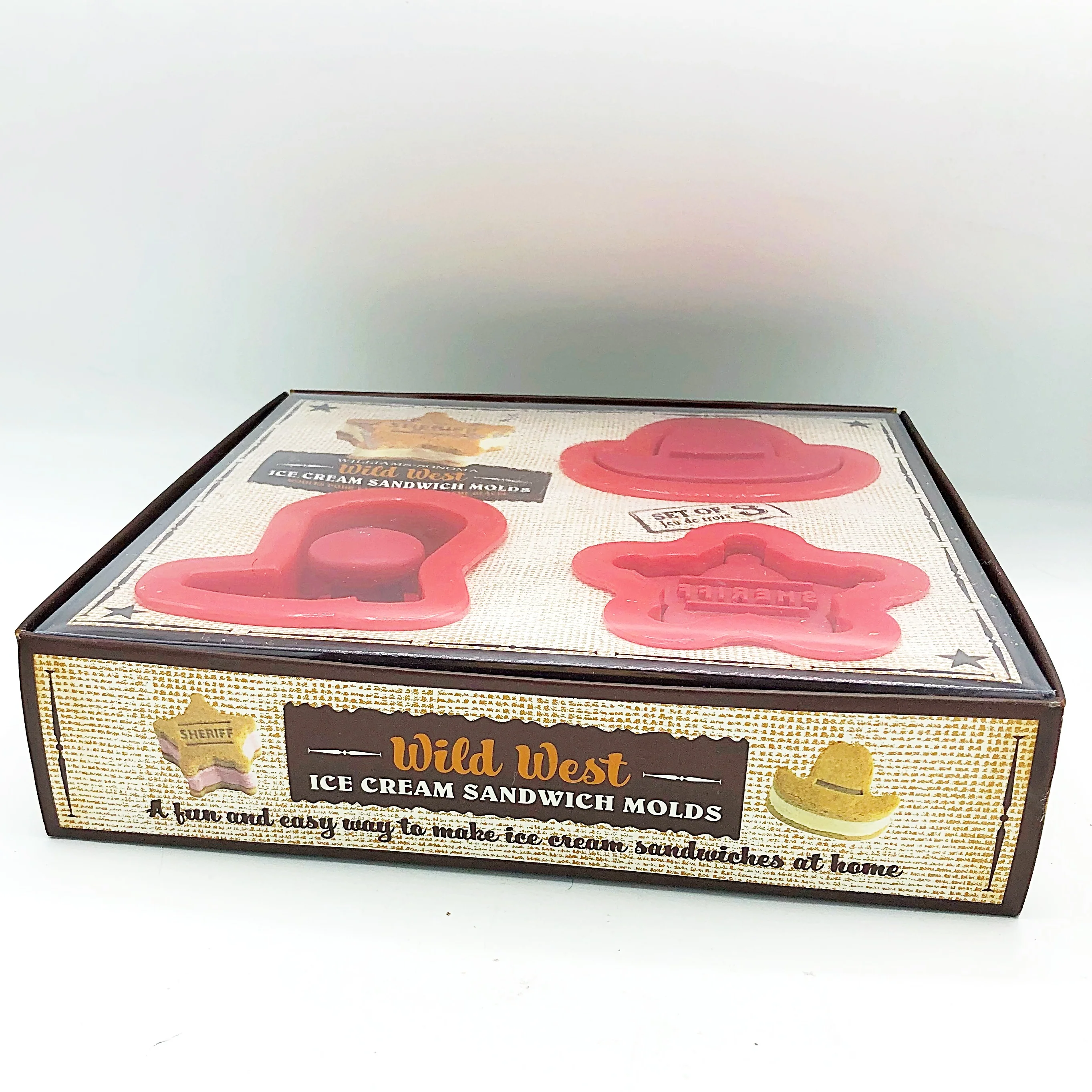 Set of 3 ice cream sandwich molds in the shape of sheriff's badge, cowboy hat and boot. Includes directions.
